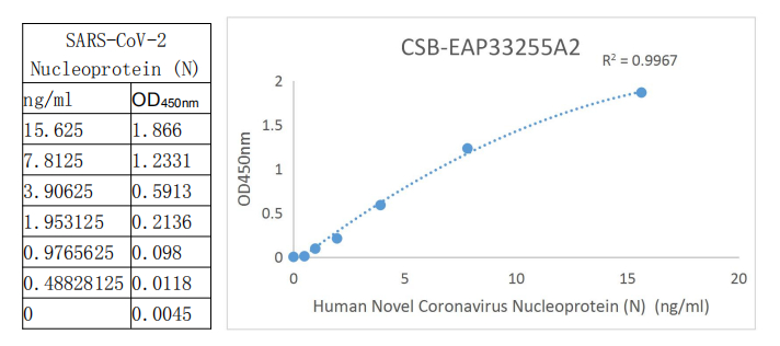 • CSB-EAP33255A2 is a solid phase sandwich Enzyme Linked-Immuno-Sorbent Assay (Sandwich ELISA). An antibody specific for SARS-CoV-2 Nucleoprotein (N) has been pre-coated onto the microwells. The SARS-CoV-2 Nucleoprotein (N) protein in samples is captured by the coated antibody after incubation. Following extensive washing, another antibody HRP conjugated specific for SARS-CoV-2 Nucleoprotein (N) is added to detect the captured SARS-CoV-2 Nucleoprotein (N) protein. Followed by Tetramethyl-benzidine (TMB) reagent. Solution containing sulfuric acid is used to stop color development and the color intensity which is proportional to the quantity of bound protein is measurable at 450nm.