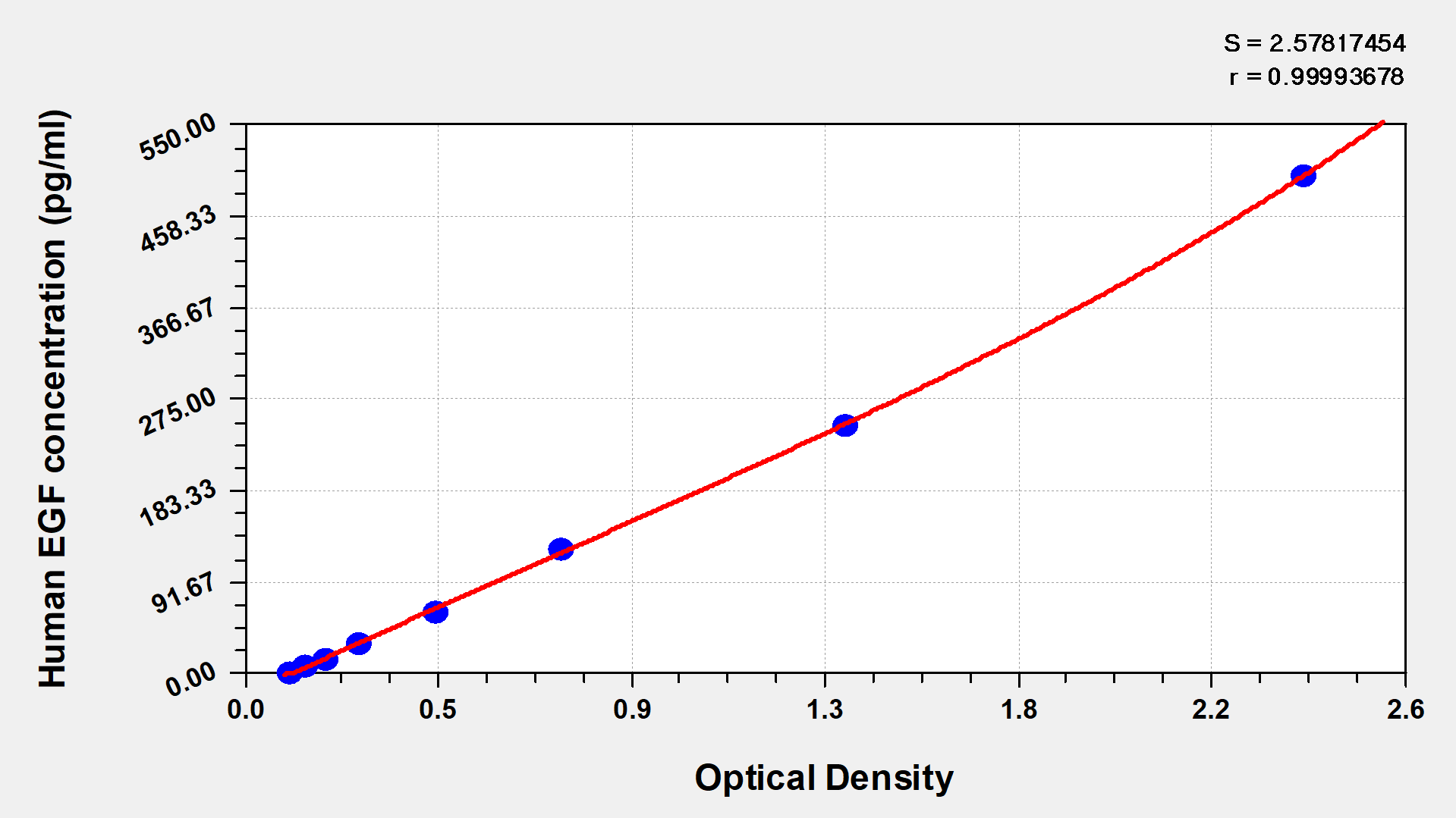 To assess the linearity of the assay, samples were spiked with high concentrations of human EGF in various matrices and diluted with the Sample Diluent to produce samples with values within the dynamic range of the assay. |