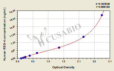To assess the linearity of the assay, samples were spiked with high concentrations of human REG-4 in various matrices and diluted with the Sample Diluent to produce samples with values within the dynamic range of the assay. Sample Serum(n=4) 1:1 Average % 87 Range % 83-92 1:2 Average % 92 Range % 90-95 1:4 Average % 96 Range % 93-99 1:8 Average % 95 Range % 88-98 -