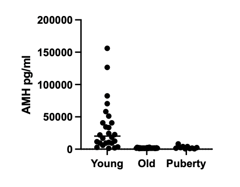 Sertoli cells of fetal testes, and testes just after birth, but absent in adult testes. In female, AMH is expressed after birth in the granulosa cells of the follicle. AMH expression is dependent on the degree of follicular maturation and not on the age o