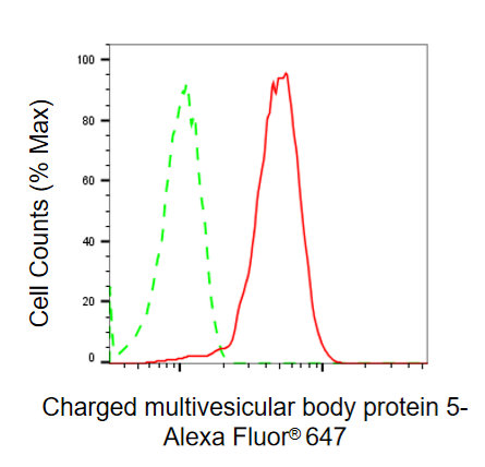 Flow cytometric analysis of Charged multivesicular body protein 5 expression in HepG2 cells using Charged multivesicular body protein 5 antibody. Green, isotype control; red, Charged multivesicular body protein 5.