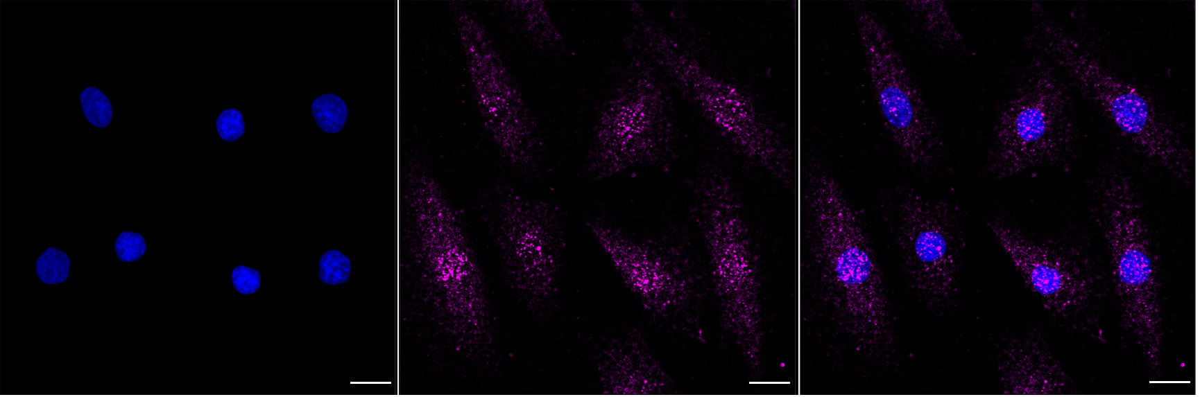 • Immunocytochemical staining of H9c2 cells with Carnosine dipeptidase 2 antibody. Nuclei were stained blue with DAPI; Carnosine dipeptidase 2 was stained magenta with Alexa Fluor? 647. Images were taken using Leica stellaris 5. Protein abundance based on laser Intensity and smart gain: Low. Scale bar, 20 μm.