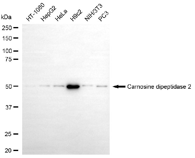 • Western blotting analysis using carnosine dipeptidase 2 antibody. Total cell lysates (30 μg) from various cell lines were loaded and separated by SDS-PAGE. The blot was incubated with carnosine dipeptidase 2 antibody and HRP-conjugated goat anti-mouse secondary antibody respectively.