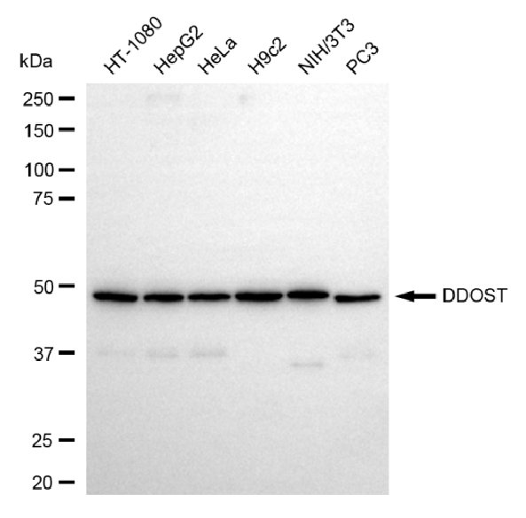 Western blotting analysis using DDOST antibody. Total cell lysates (30 μg) from various cell lines were loaded and separated by SDS-PAGE. The blot was incubated with DDOST antibody and HRP-conjugated goat mouse secondary antibody respectively.