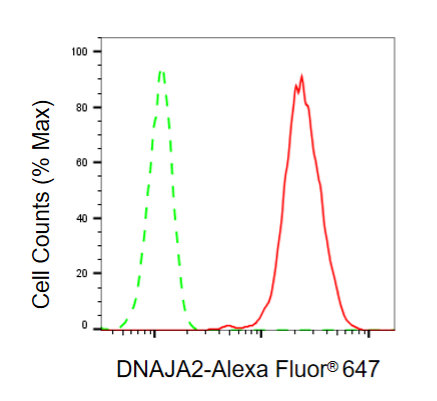 Flow cytometric analysis of DNAJA2 expression in C2C12 cells using DNAJA2 antibody. Green, isotype control; red, DNAJA2.