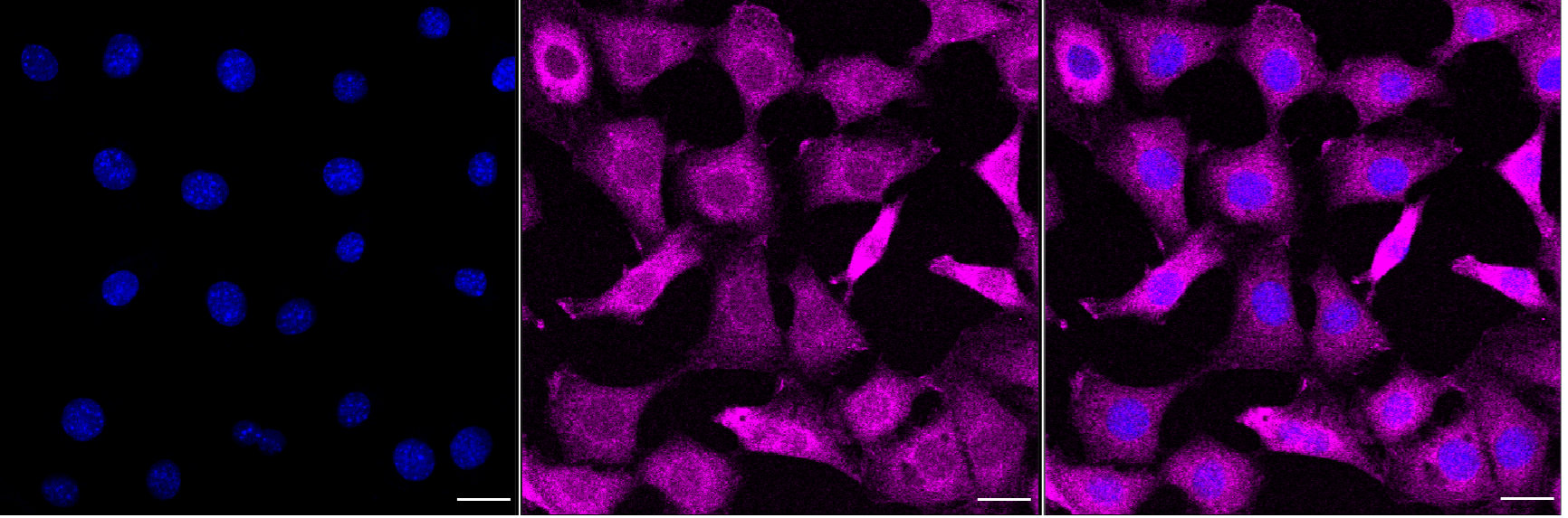 Immunocytochemical staining of C2C12 cells with DNAJA2 antibody. Nuclei were stained blue with DAPI; DNAJA2 was stained magenta with Alexa Fluor? 647. Images were taken using Leica stellaris 5. Protein abundance based on laser Intensity and smart gain:. Scale bar, 20 μm.