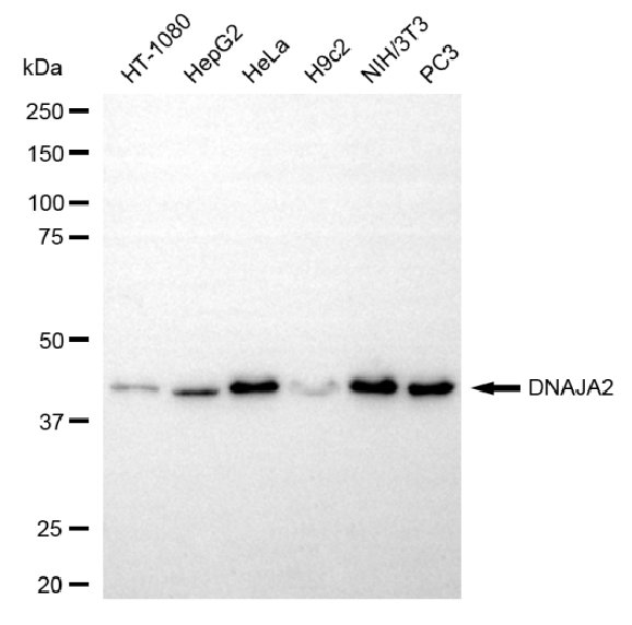 Western blotting analysis using DNAJA2 antibody. Total cell lysates (30 μg) from various cell lines were loaded and separated by SDS-PAGE. The blot was incubated with DNAJA2 antibody and HRP-conjugated goat mouse secondary antibody respectively.