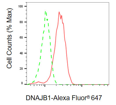 Flow cytometric analysis of DNAJB1 expression in HepG2 cells using DNAJB1 antibody. Green, isotype control; red, DNAJB1.