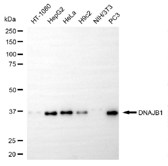 Western blotting analysis using DNAJB1 antibody. Total cell lysates (30 μg) from various cell lines were loaded and separated by SDS-PAGE. The blot was incubated with DNAJB1 antibody and HRP-conjugated goat anti-mouse secondary antibody respectively.