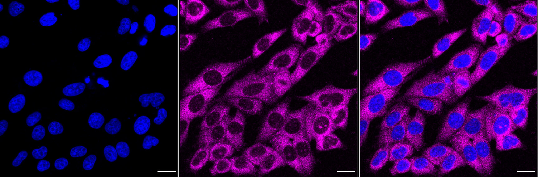 Immunocytochemical staining of HepG2 cells with EIF2AK2 antibody. Nuclei were stained blue with DAPI; EIF2AK2 was stained magenta with Alexa Fluor? 647. Images were taken using Leica stellaris 5. Protein abundance based on laser Intensity and smart gain: Medium. Scale bar, 20 μm.