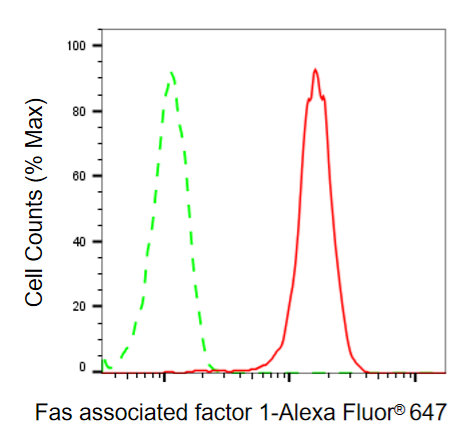 Flow cytometric analysis of Fas associated factor 1 expression in HepG2 cells using Fas associated factor 1 antibody. Green, isotype control; red, Fas associated factor 1.