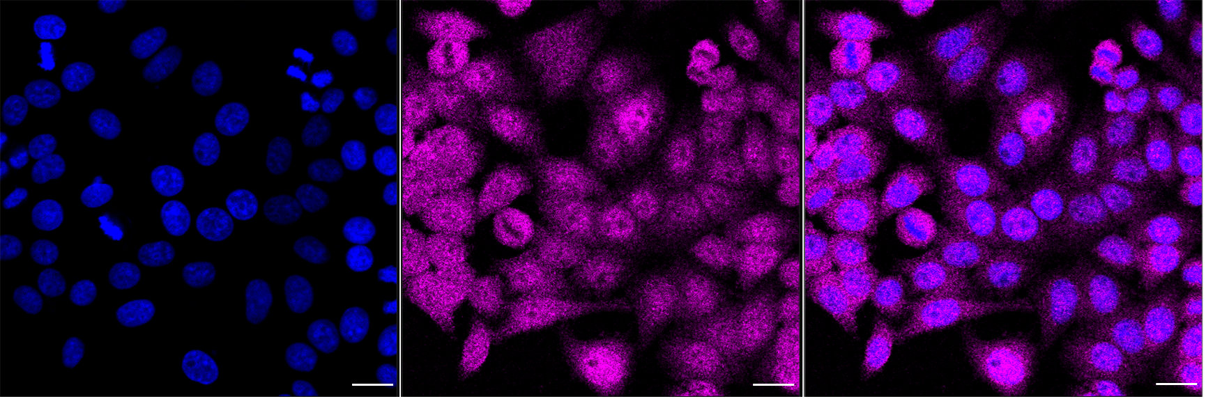 Immunocytochemical staining of HepG2 cells with Fas associated factor 1 antibody. Nuclei were stained blue with DAPI; Fas associated factor 1 was stained magenta with Alexa Fluor? 647. Images were taken using Leica stellaris 5. Protein abundance based on laser Intensity and smart gain:. Scale bar, 20 μm.