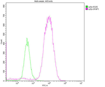Overlay histogram showing SH-SY5Y cells stained with CSB-MA009369A0m (red line). The cells were fixed with 70% Ethylalcohol (18h) and then permeabilized with 0.3% Triton X-100 for 2 min. The cells were then incubated in 1x PBS /10% normal goat serum to block non-specific protein-protein interactions followed by the antibody (10µg/1*106cells) for 1 h at 4°C. The secondary antibody used was FITC goat anti-mouse IgG(H+L) at 1/200 dilution for 1 h at 4°C. Isotype control antibody (green line) was mouse IgG2b (10µg/1*106cells) used under the same conditions. Acquisition of >10,000 events was performed.