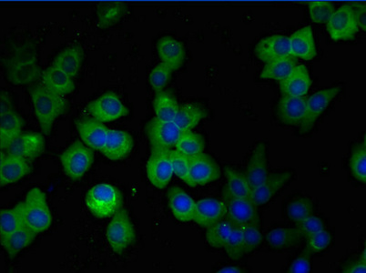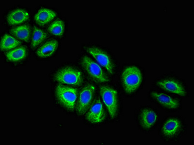 Immunofluorescent analysis of A549 cells using CSB-MA009369A0m at a dilution of 1:100 and Alexa Fluor 488-congugated AffiniPure Goat Anti-Mouse IgG(H+L).