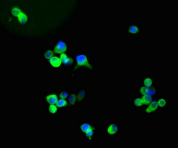 Immunofluorescent analysis of U251 cells using CSB-MA009369A0m at a dilution of 1:100 and Alexa Fluor 488-congugated AffiniPure Goat Anti-Mouse IgG(H+L).