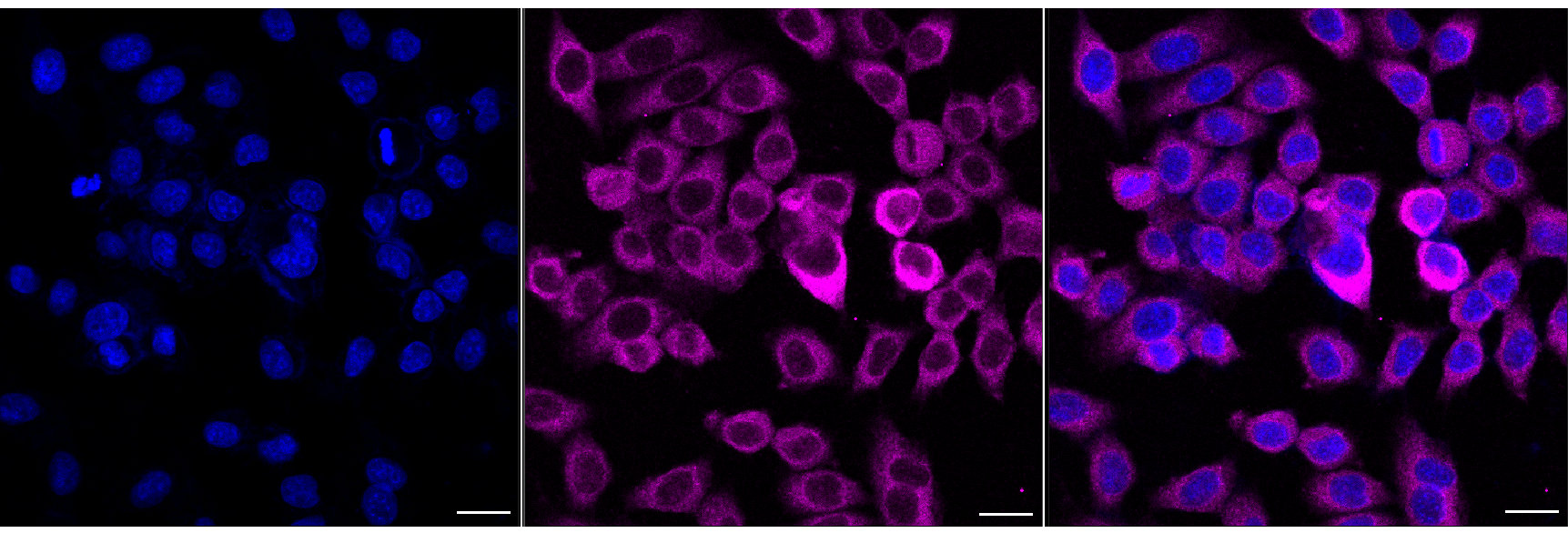 Immunocytochemical staining of HepG2 cells with HARS1 antibody. Nuclei were stained blue with DAPI; HARS1 was stained magenta with Alexa Fluor? 647. Images were taken using Leica stellaris 5. Protein abundance based on laser Intensity and smart gain: Medium. Scale bar, 20 μm.