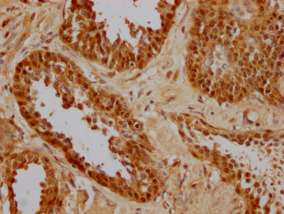 IHC image of CSB-MA010829A0m diluted at 1:256 and staining in paraffin-embedded human prostate cancer performed on a Leica BondTM system. After dewaxing and hydration, antigen retrieval was mediated by high pressure in a citrate buffer (pH 6.0). Section was blocked with 10% normal goat serum 30min at RT. Then primary antibody (1% BSA) was incubated at 4°C overnight, and detected by a Goat anti-mouse IgG polymer labeled by HRP and visualized using 0.05% DAB.