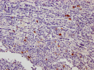 IHC image of CSB-MA012719A0m diluted at 1:500 and staining in paraffin-embedded human tonsil tissue performed on a Leica BondTM system. After dewaxing and hydration, antigen retrieval was mediated by high pressure in a citrate buffer (pH 6.0). Section was blocked with 10% normal goat serum 30min at 37°C Then primary antibody (1% BSA) was incubated at 4°C overnight. The primary is detected by a Goat anti-Mouse IgG labeled by HRP and visualized using 0.05% DAB.