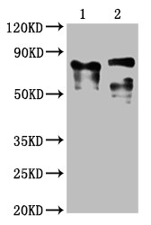 Positive WB detected in: 1 lane: Recombinant proteins with LAG3; 2 lane: 293F whole cell lysate transfected with LAG3
