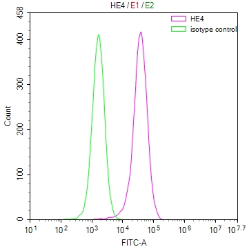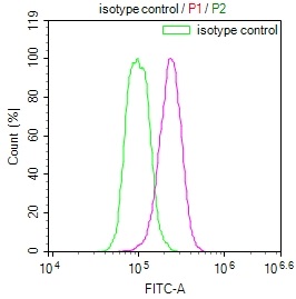 Overlay Peak curve showing A549 cells stained with CSB-MA012719A0m (red line) at 1:100. The cells were incubated in 10% normal goat serum to block non-specific protein-protein interactions followed by the antibody (1μg/1*106cells) for 1h at 4°C. The secondary antibody used was FITC-conjugated Goat Anti-Mouse IgG(H+L) at 1/100 dilution for 30min at 4°C. Isotype control antibody (green line) was mouse IgG1 (1μg/1*106cells) used under the same conditions. Acquisition of >10,000 events was performed.