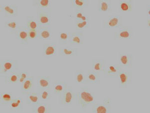 Immunocytochemistry analysis of CSB-MA888008A0m diluted at 1:100 and staining in Hela cells performed on a Leica BondTM system. The cells were fixed in 4% formaldehyde, permeabilized using 0.2% Triton X-100 and blocked with 10% normal goat serum 30min at RT. Then primary antibody (1% BSA) was incubated at 4°C overnight. The primary is detected by a biotinylated secondary antibody and visualized using an HRP conjugated SP system.