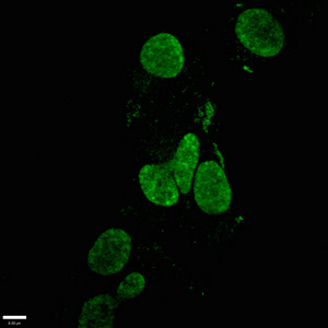 Immunofluorescence staining of Ntera-2 cells with CSB-MA888008A0m at 1:100, counter-stained with DAPI. The cells were blocked in 10% normal Goat Serum and then incubated with the primary antibody overnight at 4°C. The secondary antibody was Alexa Fluor 488-congugated AffiniPure Goat Anti-Mouse IgG(H+L).