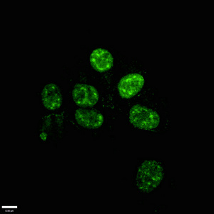 Immunofluorescence staining of Hela cells with CSB-MA888008A0m at 1:100, counter-stained with DAPI. The cells were blocked in 10% normal Goat Serum and then incubated with the primary antibody overnight at 4°C. The secondary antibody was Alexa Fluor 488-congugated AffiniPure Goat Anti-Mouse IgG(H+L).