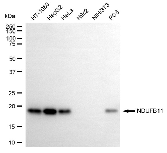 Western blotting analysis using NDUFB11 antibody. Total cell lysates (30 μg) from various cell lines were loaded and separated by SDS-PAGE. The blot was incubated with NDUFB11 antibody and HRP-conjugated goat mouse secondary antibody respectively.