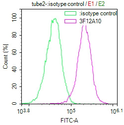 Overlay Peak curve showing HepG2 cells stained with CSB-MA010418PA28ph02HU (red line) at 1:100. The cells were incubated in 10% normal goat serum to block non-specific protein-protein interactions followed by the antibody (1μg/1*106cells) for 1h at 4°C. The secondary antibody used was FITC-conjugated Goat Anti-Mouse IgG(H+L) at 1/100 dilution for 30min at 4°C. Isotype control antibody (green line) was mouse IgG1 (1μg/1*106cells) used under the same conditions. Acquisition of >10,000 events was performed.