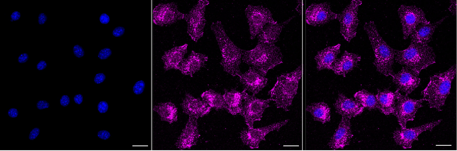 • Immunocytochemical staining of C2C12 cells with RALB associated protein antibody. Nuclei were stained blue with DAPI; RALB associated protein was stained magenta with Alexa Fluor? 647. Images were taken using Leica stellaris 5. Protein abundance based on laser Intensity and smart gain: Low. Scale bar, 20 μm.