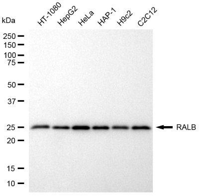 • Western blotting analysis using RALB antibody. Total cell lysates (30 μg) from various cell lines were loaded and separated by SDS-PAGE. The blot was incubated with RALB antibody and HRP-conjugated goat mouse secondary antibody respectively.