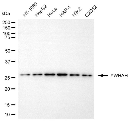 Western blotting analysis using YWHAH antibody. Total cell lysates (30 μg) from various cell lines were loaded and separated by SDS-PAGE. The blot was incubated with YWHAH antibody and HRP-conjugated goat anti-mouse secondary antibody respectively.