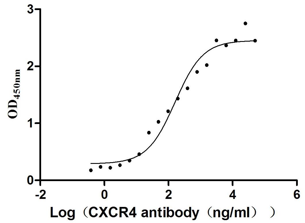 Measured by its binding ability in a functional ELISA. Immobilized Human CXCR4 at 10 μg/ml can bind Anti-CXCR4 recombinant antibody (CSB-RA006254MA01HU), the EC50 is 101.7-253.6 ng/mL. Biological Activity Assay