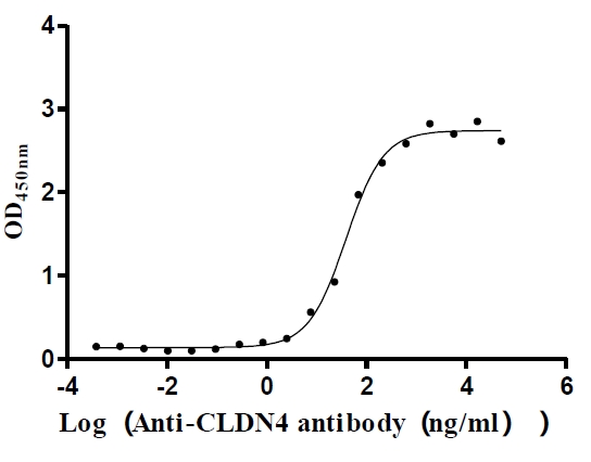 Measured by its binding ability in a functional ELISA. Immobilized Human CLDN4 at 5 μg/ml can bind Anti-CLDN4 recombinant antibody (CSB-RA005506MA1HU), the EC50 is 29.56-50.75 ng/mL. Biological Activity Assay