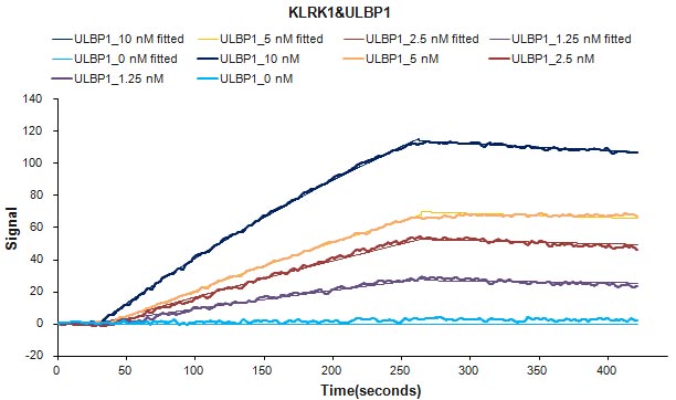 Human KLRK1 protein Fc tag (CSB-MP012474HU1) captured on COOH chip can bind Human ULBP1 protein Fc/myc tag (CSB-MP887177HU) with an affinity constant of 2.27 nM as detected by LSPR Assay. Biological Activity Assay