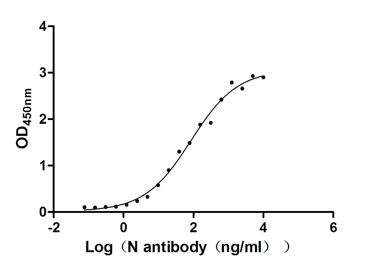 Measured by its binding ability in a functional ELISA. Immobilized N (CSB-EP3325GMY(M3)) at 2 μg/ml can bind N Recombinant Antibody(CSB-RA33255A1GMY), the EC50 of N Recombinant Antibody is 63.78-113.6 ng/ml. Biological Activity Assay