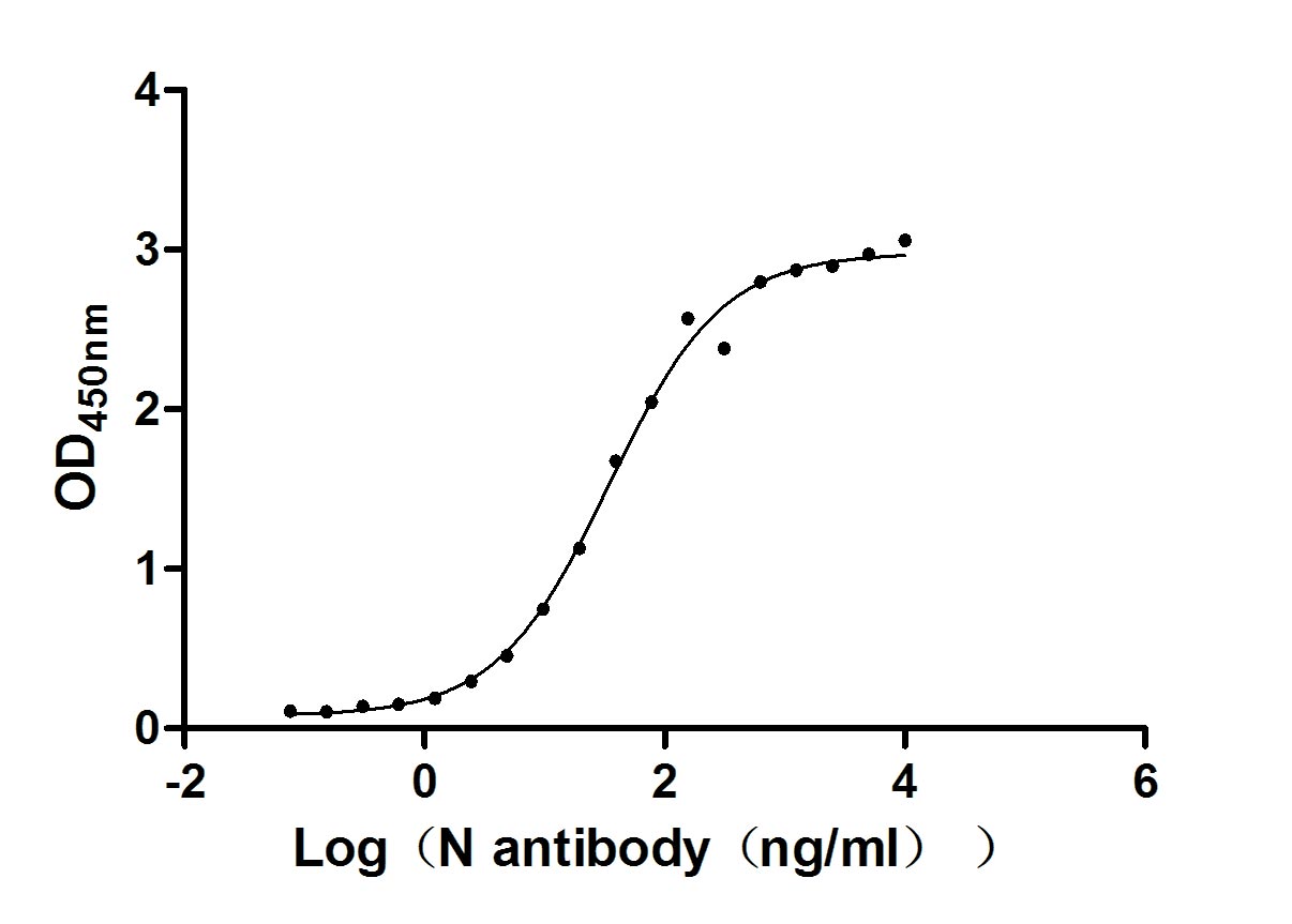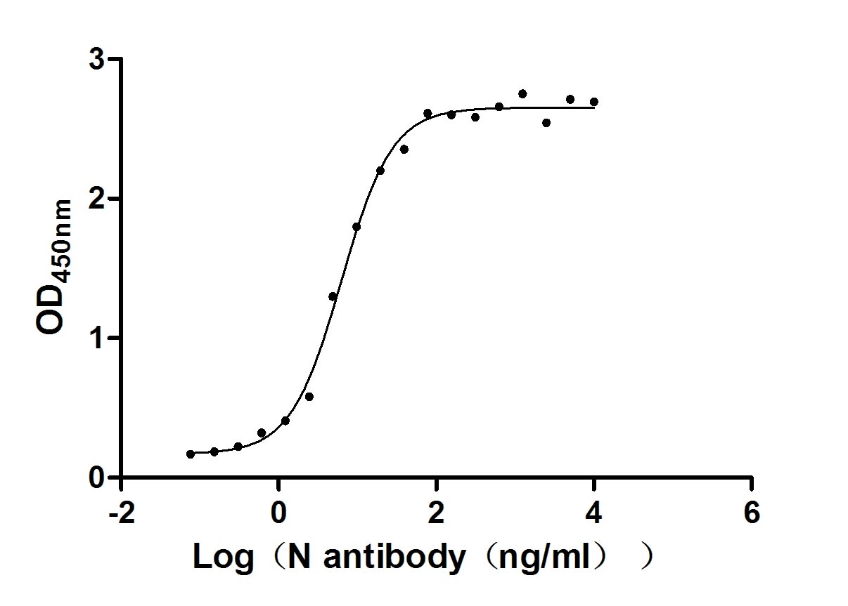 Measured by its binding ability in a functional ELISA. Immobilized N (CSB-EP3325GMY(M2)) at 2 μg/ml can bind N Mouse Monoclonal Antibody(CSB-MA33255A2m), the EC50 of N Mouse Monoclonal Antibody is 5.660-6.932 ng/ml. Biological Activity Assay -