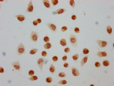 Immunocytochemistry analysis of CSB-PA010429OA05hibHU diluted at 1:80 and staining in Hela cells (treated with 30mM sodium butyrate for 4h) performed on a Leica BondTM system. The cells were fixed in 4% formaldehyde, permeabilized using 0.2% Triton X-100 and blocked with 10% normal goat serum 30min at RT. Then primary antibody (1% BSA) was incubated at 4°C overnight. The primary is detected by a biotinylated secondary antibody and visualized using an HRP conjugated SP system.