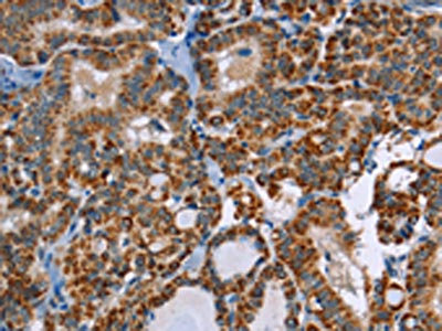The image on the left is immunohistochemistry of paraffin-embedded Human thyroid cancer tissue using CSB-PA598314(ABCB1 Antibody) at dilution 1/30, on the right is treated with synthetic peptide. (Original magnification: ×200)