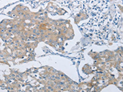 The image on the left is immunohistochemistry of paraffin-embedded Human breast cancer tissue using CSB-PA937099(ABCB9 Antibody) at dilution 1/15, on the right is treated with synthetic peptide. (Original magnification: ×200)