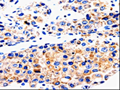 The image on the left is immunohistochemistry of paraffin-embedded Human liver cancer tissue using CSB-PA440339(ABCG2 Antibody) at dilution 1/50, on the right is treated with synthetic peptide. (Original magnification: ×200)