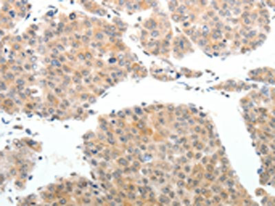 The image on the left is immunohistochemistry of paraffin-embedded Human liver cancer tissue using CSB-PA119696(ABL2 Antibody) at dilution 1/25, on the right is treated with synthetic peptide. (Original magnification: ×200)