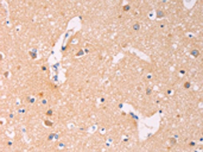 The image on the left is immunohistochemistry of paraffin-embedded Human brain tissue using CSB-PA901817(ADCY1 Antibody) at dilution 1/60, on the right is treated with synthetic peptide. (Original magnification: ×200)