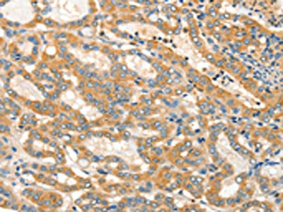 • The image on the left is immunohistochemistry of paraffin-embedded Human thyroid cancer tissue using CSB-PA106602(ADCY3 Antibody) at dilution 1/30, on the right is treated with fusion protein. (Original magnification: ×200)
