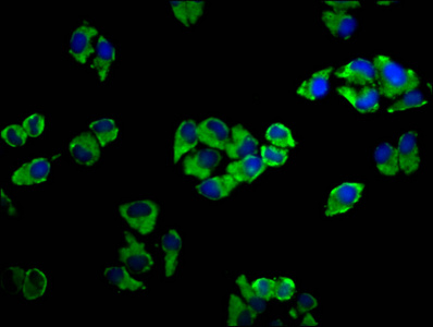 Immunofluorescence staining of Hela cells with CSB-PA001341LA01HU at 1:33, counter-stained with DAPI. The cells were fixed in 4% formaldehyde, permeabilized using 0.2% Triton X-100 and blocked in 10% normal Goat Serum. The cells were then incubated with the antibody overnight at 4°C. The secondary antibody was Alexa Fluor 488-congugated AffiniPure Goat Anti-Rabbit IgG(H+L).