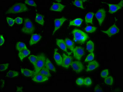 • Immunofluorescence staining of A549 cells with CSB-PA001344LA01HU at 1:233, counter-stained with DAPI. The cells were fixed in 4% formaldehyde, permeabilized using 0.2% Triton X-100 and blocked in 10% normal Goat Serum. The cells were then incubated with the antibody overnight at 4°C. The secondary antibody was Alexa Fluor 488-congugated AffiniPure Goat Anti-Rabbit IgG(H+L).