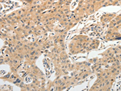 The image on the left is immunohistochemistry of paraffin-embedded Human lung cancer tissue using CSB-PA141929(ADIPOR2 Antibody) at dilution 1/20, on the right is treated with synthetic peptide. (Original magnification: ×200)