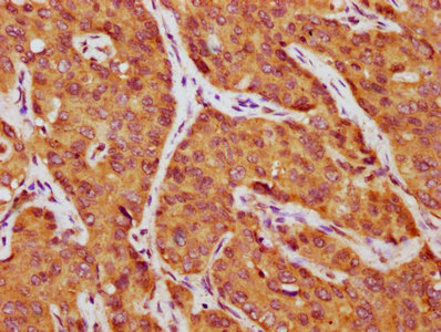 • IHC image of CSB-PA09987A0Rb diluted at 1:750 and staining in paraffin-embedded human liver cancer performed on a Leica BondTM system. After dewaxing and hydration, antigen retrieval was mediated by high pressure in a citrate buffer (pH 6.0). Section was blocked with 10% normal goat serum 30min at RT. Then primary antibody (1% BSA) was incubated at 4°C overnight. The primary is detected by a biotinylated secondary antibody and visualized using an HRP conjugated SP system.
