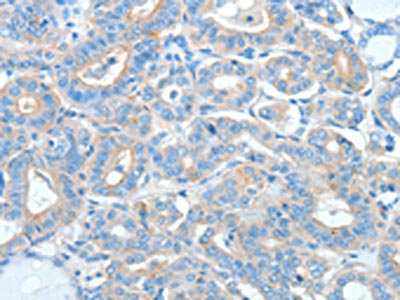 • The image on the left is immunohistochemistry of paraffin-embedded Human thyroid cancer tissue using CSB-PA290707(AGO2 Antibody) at dilution 1/20, on the right is treated with fusion protein. (Original magnification: ×200)