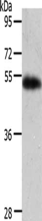 Gel: 10%SDS-PAGE, Lysate: 40 μg, Lane: Human liver cancer tissue, Primary antibody: CSB-PA446811(AGT Antibody) at dilution 1/700, Secondary antibody: Goat anti rabbit IgG at 1/8000 dilution, Exposure time: 5 minutes